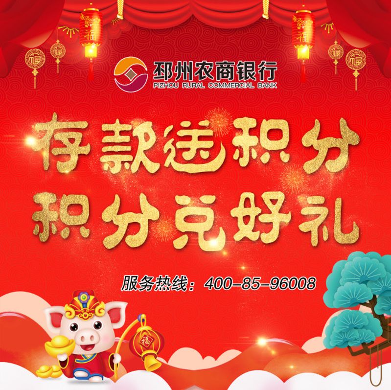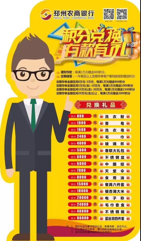 現在來邳州農商行存款送積分,積分兌大獎啦! 凡在我行辦理定期存款業務、理財業務客戶均可參與存款送積分,積分兌禮品活動,活動時間2019年1月1日-2019年3月31日。具體大獎請看下表: